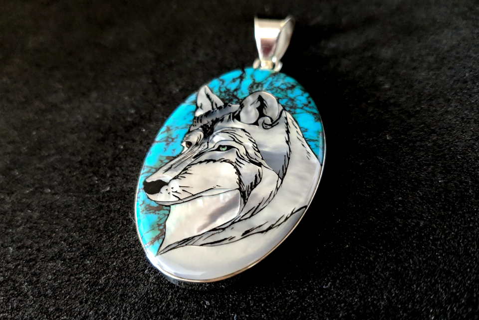 Introducing our White Wolf Inlay Pendant - a stunning piece of jewelry that showcases the beauty and grace of the wolf. Crafted with the finest materials, including mother of pearl, lab opal, and turquoise, this pendant features a beautifully detailed white wolf design that is sure to capture your heart.